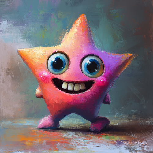 children’s book illustration , 3 d star , very very cute , very big eyes and very big broad smile with two Very big front buck teeth only , very flexible poses , oil painting with abstract brush strokes , cinematic lighting , light and shadow , very colourful, soft Pastel colours
