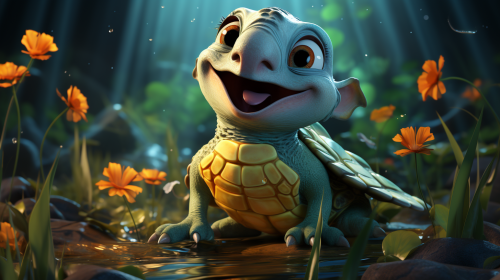 cute turtle, with big eyes and smile, singing song , charming character illustrations, exotic, rtx on --ar 16:9 --s 750