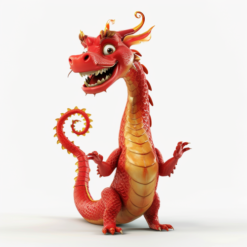 A cartoon-style Chinese dragon in red, white, and gold colors, with an athletic flair, wearing VR goggles on its head, posing as a model.