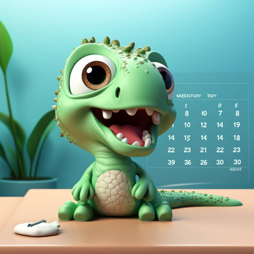 Clay animation, cute green child dinosaur (Tyrannosaurus) with big eyes, cute green child dinosaur, clay animation, smiling with mouth slightly open and looking up, light turquoise background, January calendar on wall, --v 5.2