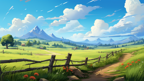cows in a pasture, cartoon style, cedar fencing in background, bright blue sky --ar 16:9 --s 250 --v 5.2