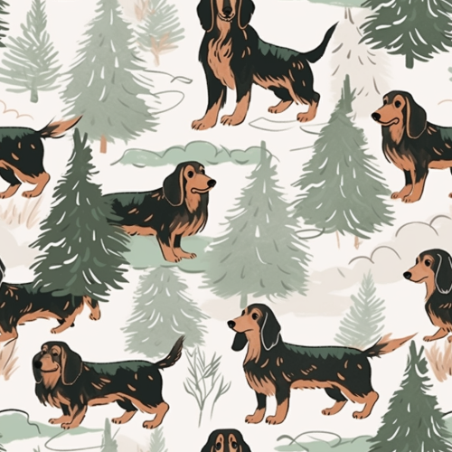 sketch and crisp pencil art style, black and brown dachshund evenly spaced, background colours of beige, forest green --tile --niji 5