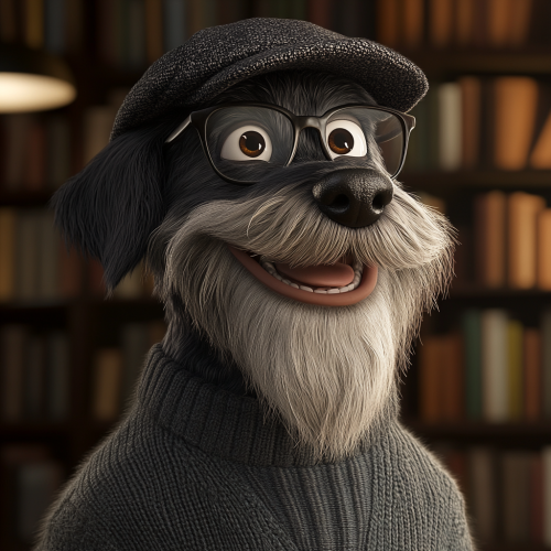 portrait of dog, wire haired pointer, smiling, chubby, black mens eyeglasses, ivy cap, gray cardigan sweater, black eyebrows, long full white beard, 3d character from Disney Pixar, no human, inside library, black box, cinematic edge lighting --ar 1:1
