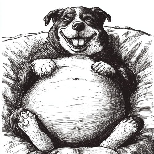 black and white simple charicature depicting an extremely overweight dog laying in a bed, dog face is sleepy with a smile on her face, huge round belly, paws in the air, mouth is open,