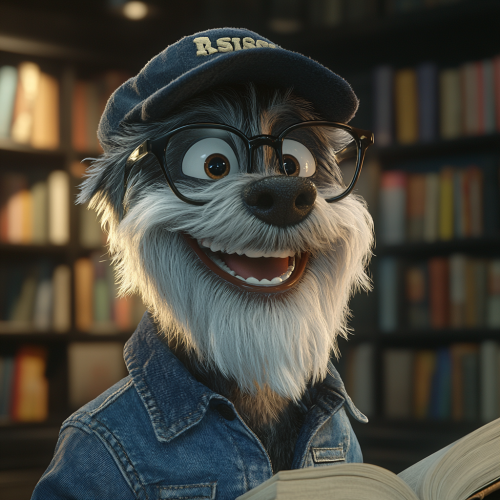 portrait of dog, wire haired pointer, smiling, chubby, black mens eyeglasses, ivy cap, denim jacket, black eyebrows, long full white beard, 3d character from Disney Pixar, no human, inside library, black box, cinematic edge lighting --ar 1:1