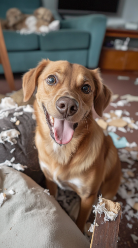 handsome brown dog, smiling at camera with tongue sticking out, sitting next to torn up dog bed pillow and chewed table leg, sitting in room looking cutely at camera, creative art --ar 9:16