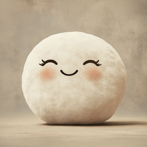 Soft, round plush toy character in a vintage, textured illustration style, similar to a dumpling shape. The character has thick, expressive eyebrows and crescent-shaped, smiling eyes for a cute and friendly expression. The mouth is small and curved with the right corner slightly lifted to create a cheerful, asymmetrical smile. The cheeks have a soft blush, enhancing the character’s endearing look. The illustration style should match a warm, hand-drawn, cozy feel with no hair, and a simple, neutral background with no text or symbols below the character.