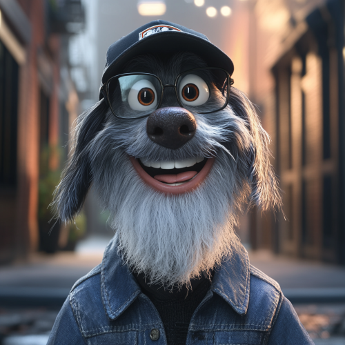 portrait of dog, wire haired pointer, smiling, chubby, black mens semi-rimless eyeglasses, trucker cap, denim jacket, black eyebrows, long full white beard, 3d character from Disney Pixar, no human, outside, daytime, black box, cinematic edge lighting --ar 1:1