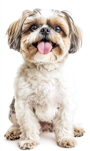 realistic photograph of a overweight shih-tzu dog is sitting on its hind legs. showing up his tongue, looking to the camera with a smily expression, isolated on white background --ar 3:5 --style raw