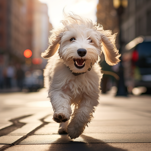 cinematicphoto, cockapoo dog in white, walking in the city, smiling face