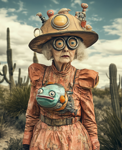 Alejandro Jordowsky surreal acid western futuristic style photography of an old grandma wearing a tank hat and a futuristic fish mechanical dress in front of a surreal desert with cactus with cute eyes and big mouths --ar 9:11