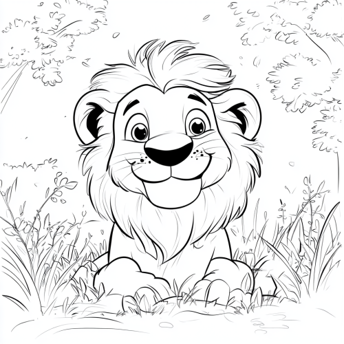 A cute lion in its natural habitat with oversized head, round body, and large eyes,outlined in thick black ink on a white background, no shading, bold clear lines, children's coloring book page illustration