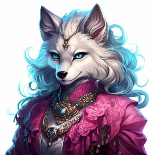 Cute anthropomorphic female wolf with magenta fur. She is wearing an ornate blue travelers dress. Anime style