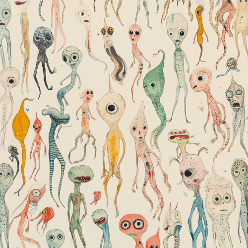 Drawing with a fine-tipped pen, featuring a group of 6 or 7 imaginative beings with milky colors, long, pale, soft, and completely boneless bodies with a texture resembling soft fish skin, and heads shaped like fish. Each being is depicted in full-body, engaged in a distinct action or gesture, with no eyes but with very small, distinct black eyes. They also have glowing slime. All beings are arranged within a single canvas, with a painterly and artistic style reminiscent of surrelism style, UNica ZUrn. Ensure they have a unique, otherworldly appearance without looking ghostly or childish