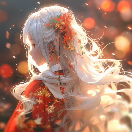 A cute girl featuring long white hair , A girl with a translucent, ethereal presence , wearing a traditional Japanese kimono, looking at me, with maple leaves scattering around, sparkling, super realistic 3D animation style. the girl’s art project coming together in a detailed and colorful manner. colorful refraction , 3d super realistic, --niji 5