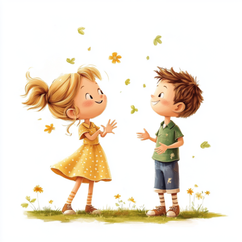 A cute girl (with blond hair bun, yellow dress, brown shoes, smiling, 2 arms with each 5 fingers) and a little boy (with brown hair, a blue short pants, a green dottet shirt, brown white shoes, 2 arms with each 5 fingers) looking down, talking to the wind, cartoony character, organic forms, evening, airy pastel color palette, spring colours, soft watercolour by liniers, white background,. 3d