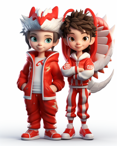3d drawing of a cute boy and girl wearing full-body red & white dragon costume on a white background --ar 4:5