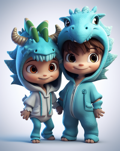 3d drawing of a cute boy and girl wearing full-body dragon costume on a white background --ar 4:5