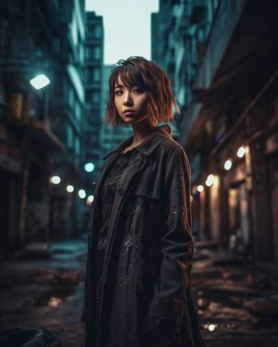 ultra wide and dynamic angle, full body in the picture , fine art photo, Japanese cute girl portrait, perfect eyes, abandoned city background, profesional color grading, soft shadows, blade runner, harajuku style hair and makeup --v 5.0 --s 750 --ar 4:5