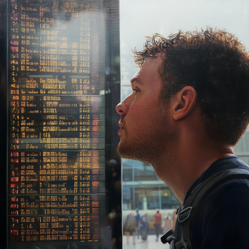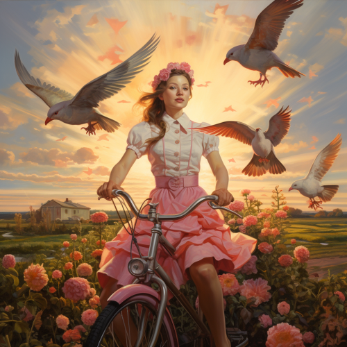 une peinture du style impressioniste. On voit une fille à bicylette et des oiseaux. L'arrière plan est la campagne avec un ciel rose et couché de soleil