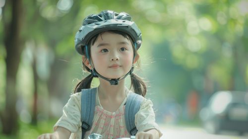 Create a highly realistic image featuring a 4-year-old Chinese girl with exceptionally realistic skin texture, who is wearing a helmet and riding her bicycle in a park. The photograph should capture the essence of childhood joy and freedom, with the girl displaying an expression of delight and curiosity as she enjoys her ride. Emphasis should be placed on the intricate details of the girl’s helmet to highlight safety, and the bicycle as a symbol of youthful exploration. The focus on achieving a lifelike representation of the girl's skin texture is crucial, aiming to convey the natural, vibrant health of a child engaged in outdoor activities. --ar 16:9 --style raw --v 6.0