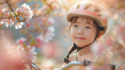 Create a highly realistic image of a 4-year-old Chinese girl wearing a helmet, joyfully riding her bicycle in a park during the warm, blossoming month of March. The scene is vibrant with spring flowers in full bloom, capturing the essence of a beautiful, sunny day. The girl's expression is one of pure happiness and freedom as she enjoys her ride along a picturesque path, surrounded by lush greenery and a variety of colorful flowers. The image should reflect the innocence and joy of childhood, with a focus on the details of the helmet for safety, and the bicycle as a symbol of youthful adventure. --ar 16:9 --v 6.0 --style raw --s 250