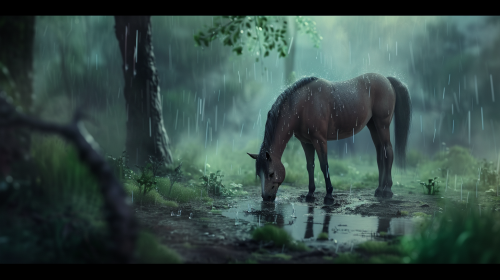 Cute little [horse], [covering from rain in the forest], Pixar, muted colors, rainy day , pastels, insanely detailed, insanely realistic ,high definition , high resolution adorable" --ar 16:9 --stylize 50 --v 6.0