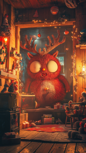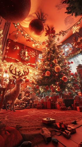 A Christmas room with CG-like texture. A pop Christmas, vivid red color tone of the world. A horror world. There is a Christmas tree. Takashi Murakami vibes. There is a big cute reindeer-like monster.