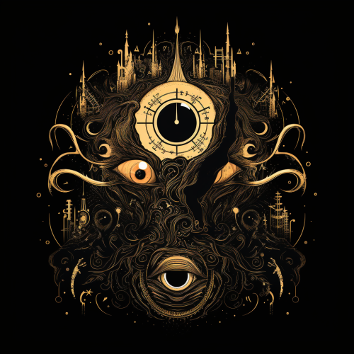 a logo featuring a large open arcane eye. It is surrounded by musical notes, ram horns. Behind the large eye is the shadows of a father, mother and a single small child