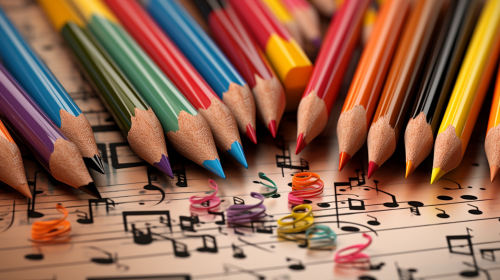 colored pencils with musical notes coming out of the pencil, background with musical notes, ultra realistic, 8k, ultra details, PHOTOGRAPHED WITH CANON R5 MIRRORLESS. Their hands and faces are very detailed and realistic photos. --v 5.2 --ar 16:9
