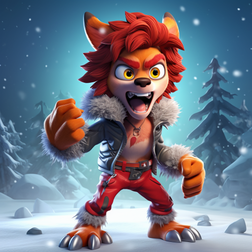 werewolf from ryder from paw patrol, comic style, in snow, angry, red hair,full body,