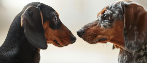 A pair of dachshund dogs in love looking into each other's eyes, portrait scene, close-up, studio light, white background, 3D. --ar 21:9 --v 6.0