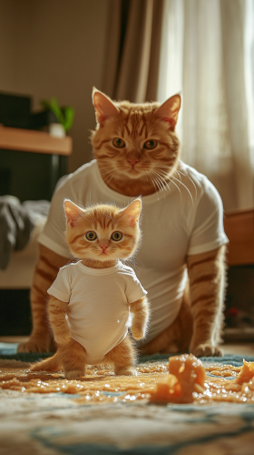 A chubby, adorable orange kitten wearing a plain white t-shirt stands in the middle of a cozy living room, its large, expressive eyes filled with wonder as it watches its father. The muscular orange father cat, also dressed in a plain white t-shirt, has a human-like, bodybuilder physique and is crouching down, engrossed in playing with sticky, colorful slime. The vibrant slime splatters across the entire living room, adding a playful mess to the scene. The father cat is significantly larger than the kitten, creating a sense of proportionate size difference. --ar 9:16