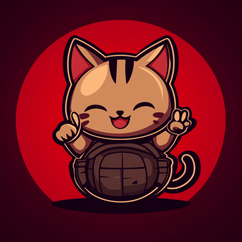 futuristic minimalistic mercenary company logo of a cute kitten with a mischevious expression pulling the pin off a grenade with its teeth, winking and giving the peace sign