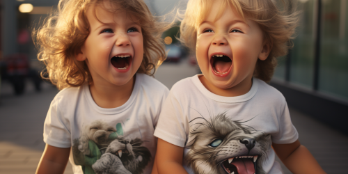 two little cute laughing kids trying to fit together in one t-shirt, hyper realistic, 8k, photorealism, soft lighting, v5, high definition with close attentional to anatomical accuracy --ar 2:1 --v 5.2