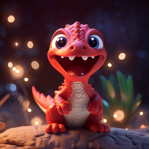 Clay animation, cute red child dinosaur (tyrannosaurus) with big eyes, mouth slightly open, looking up and smiling, adorable expression, cute red child dinosaur (tyrannosaurus) with big eyes, blue glowing jellyfish and Jupiter in background, --v 5.2