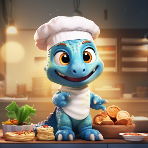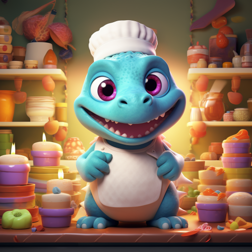 ????, lots of candy, chef costume, cookies, baking, cooking, clay animation style, colorful dinosaur baby with big eyes, ?, cute smiling face, chef costume, background is cooking room, --v 5.2