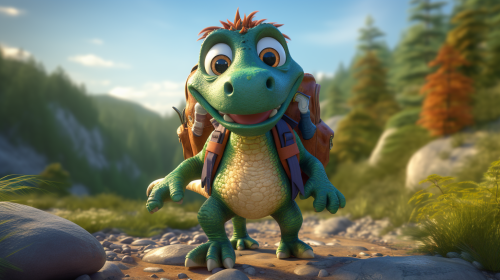 a small and curious dinosaur carrying his backpack and on his way to explore the world, fairy tale, cartoon style, size 16:9, --ar 16:9