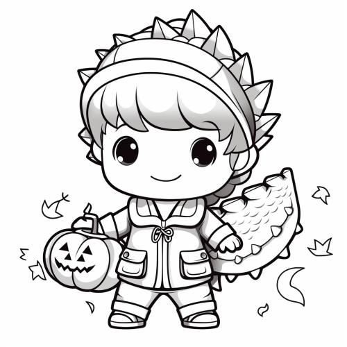 kid in dinosaur halloween costume, thick black outline, outline only, kawaii, children's coloring page