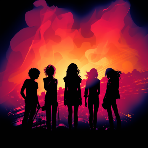A promotional photo of an idol group consisting of five 20-year-old girls, each wearing an adorable dinosaur costume. These costumes are designed to be vibrant and eye-catching, reflecting each member's individuality and the group's cohesive theme. They are posed in a dynamic and engaging formation on a stage with bright, colorful lighting that enhances the energetic atmosphere. Each girl showcases a signature pose that complements her dinosaur costume, with expressions ranging from playful winks to bright, inviting smiles. The background is a blur of concert lights and faint silhouettes of a cheering audience, emphasizing the group's performance vibe. This image should capture the unique concept of the idol group, combining the cuteness of dinosaur costumes with the charisma and style of young pop idols, conveying a sense of fun, teamwork, and entertainment.