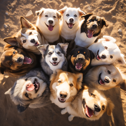 aerial view of a group of happy dogs sitting together in a heart shape formation looking upwards