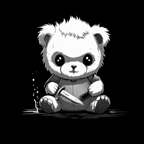 illustration of a cute bear mit knive, very tired, black and white, excited, game style, design, black background, iw 3, chaos 50 --style raw