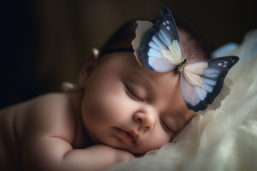 An HD image of a just-born infant with delicate blue-shaded butterfly wings, eyes closed, and wearing a gentle black ribbon around her eyes. The infant lies in a soft, ethereal light, surrounded by a dreamy, serene atmosphere with a gentle background blur to focus on the baby's peaceful face and vibrant wings. Soft lighting highlights the delicate wings and the baby's features, evoking a sense of innocence and calm. --v 5.0 --ar 3:2