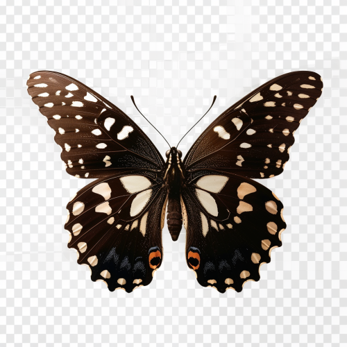 png white background, A flat vector illustration of a butterfly with symmetrical wings, viewed from a top-down angle. The left wing is a detailed depiction of a typical butterfly wing, showcasing intricate patterns, vibrant colors, and delicate textures. The right wing is creatively designed to resemble a blossoming flower, with petals forming the shape of a butterfly wing, in the style of animated illustrations, [environment], full body, text-based --style raw --v 5.1