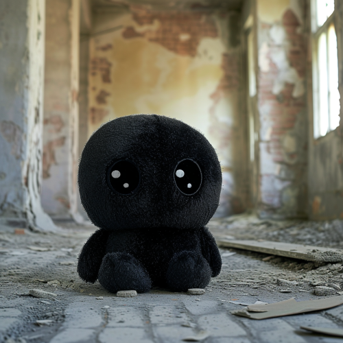 Product photo of kawaii cute shadow creature plush toy made of black crystal super soft fabric with cute white eyes. Background is abandoned and decaying bedroom. Tags: kawaii, plushy, cute, soft --v 6.0