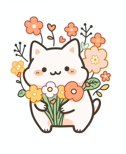 super cute kawaii cat with flowers. Kawaii cartoon style, coloring book, bold black outlines, crisp thick lines, clean line art, no gradients, white background, no shading, no gradients --ar 9:11 --niji 5