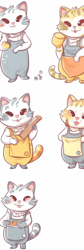 Cute kitten character art, illustration style, white background, thick outline, artist Kun is wearing an apron and drawing.--ar 16:9 --v 5.0