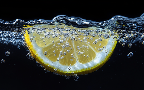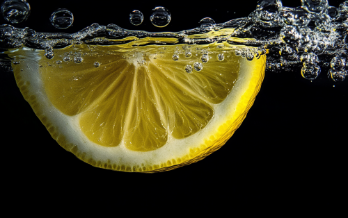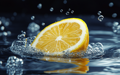 A tall glass of water with a lemon slice and a refreshing drop of condensation trickling down the side. The glass is set next to a water bottle on a clean, minimalistic table, surrounded by fresh fruits and greens. The image suggests the importance of hydration for health.