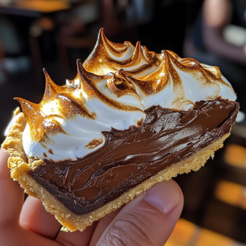 An amateur photo of a decadent chocolate pie slice, held in hand. The pie features a smooth, rich chocolate filling, encased in a golden, flaky crust. On top is a thick, beautifully toasted meringue layer with peaks that are golden-brown, adding a delightful contrast of textures. The meringue is fluffy and light, complementing the dense, creamy chocolate below. The lighting emphasizes the shine of the chocolate and the crispy edges of the meringue, making the pie look indulgent and perfectly homemade