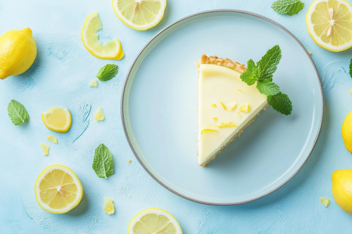 STYLE: Close-up Shot Top view | EMOTION: Tempting I SCENE:Cheesecake A slice of lemon pie on an elegant plate, placed against a pastel blue background with scattered mint leaves and sliced lemons around it. The scene is illuminated by soft natural light, creating a fresh and inviting atmosphere. This top-down view captures the vibrant colors and textures of both the food and the dish in a high-resolution photography style. | TAGS: High-end food photography, clean composition, dramatic lighting, luxurious, elegant, mouth-watering, indulgent, gourmet | CAMERA: Nikon Z7 | FOCAL LENGTH: 50mm | SHOT TYPE: Close-up | COMPOSITION: Top view Centered | LIGHTING: Soft directional light | PRODUCTION: Food Stylist --ar 3:2